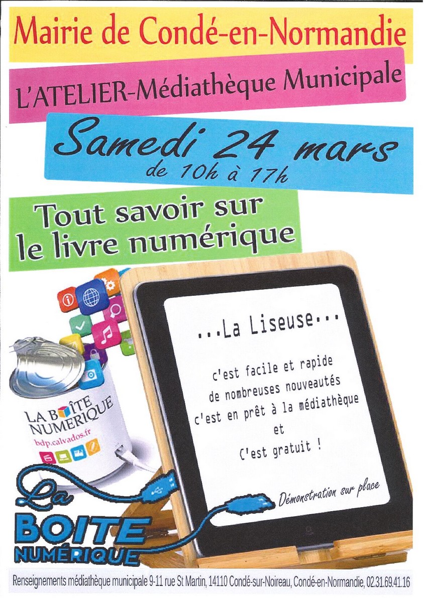 Tout savoir sur l’utilisation de la liseuse et sur le téléchargement d’un livre via la Boite Numérique….Rendez-vous à la médiathèque pour des démonstrations de 10h à 17h.